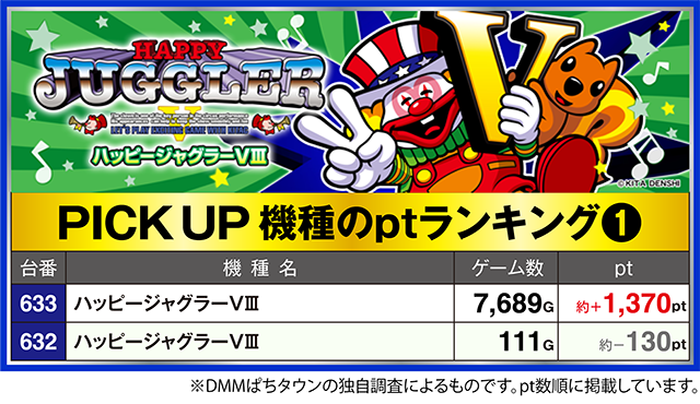「ハッピージャグラーVⅢ」の633番台が約+1,370pt。