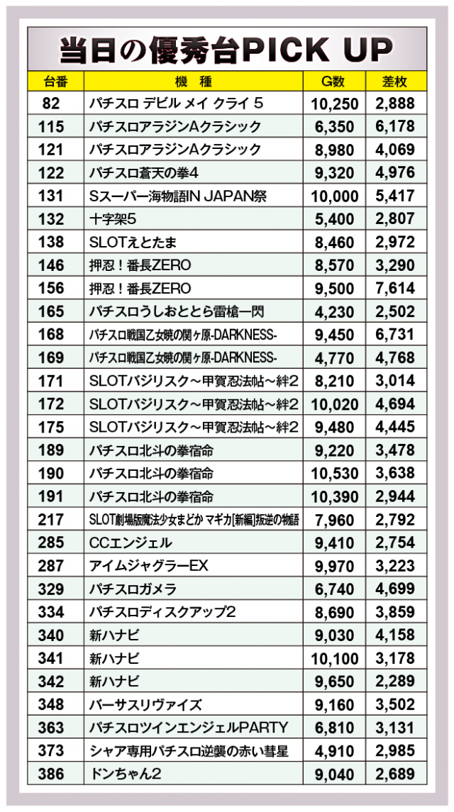それではさっそく当日の模様をチェックしていこう。まずは優秀30台PICK UPから。30台全てが差枚数+2千枚以上、うち20台が+3千枚以上と高水準の出玉に。後述する好調4機種以外では、『パチスロアラジンAクラシック』『パチスロ戦国乙女暁の関ケ原-DARKNESS-』がそれぞれ+6千枚オーバーを記録した!