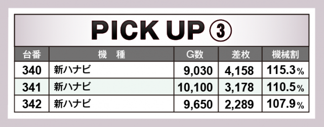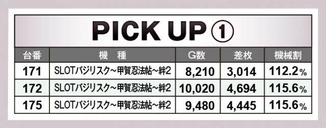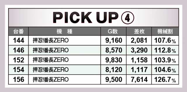 さらにここからは当日好調だった4機種に注目。まずは『SLOTバジリスク~甲賀忍法帖~絆2』、+4千枚台の2台を筆頭に3台合計で+1万2千枚オーバー! さらに『パチスロ北斗の拳宿命』『新ハナビ』がいずれも3台横並びで各台差枚+2,000枚オーバーをマークする好調ぶりだった。そして忘れてはいけない人気機種『押忍!番長ZERO』が156番台+7千枚台を含む5台合計で+1万5千枚を突破した!