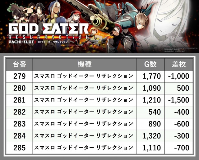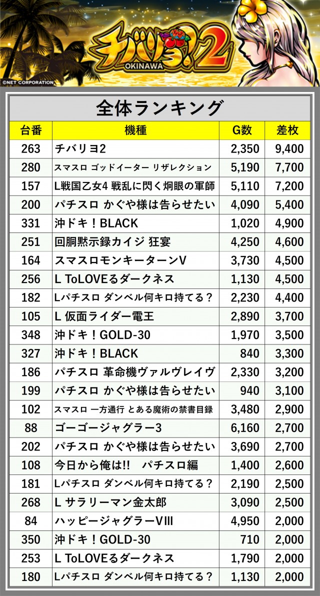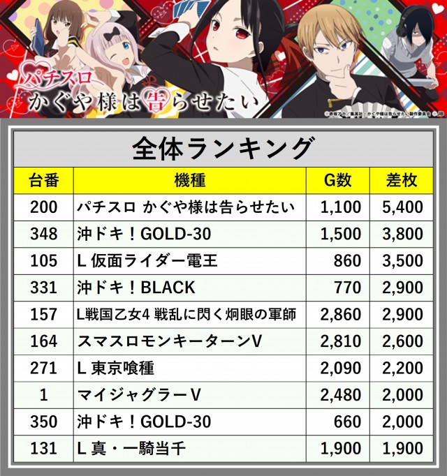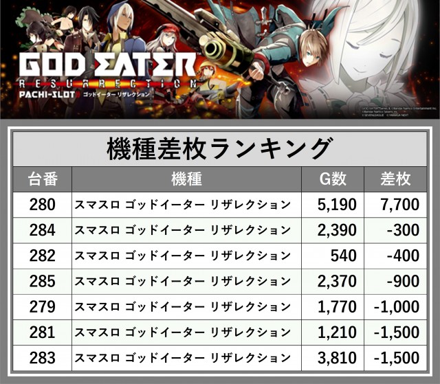 ※差枚数順に掲載しています
