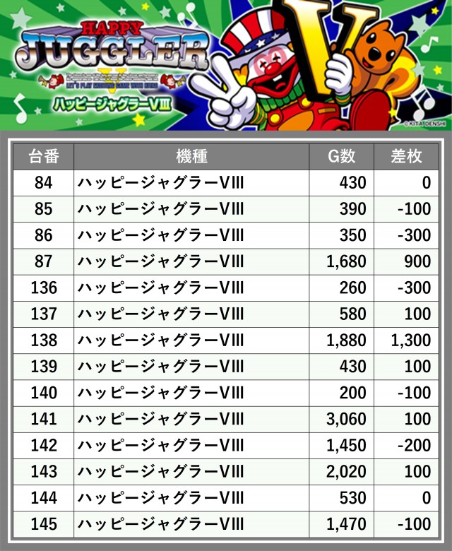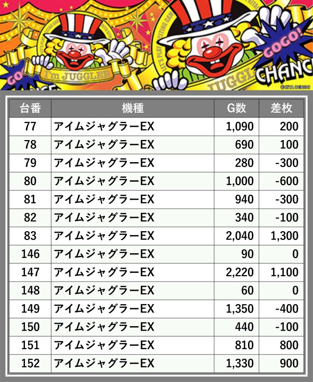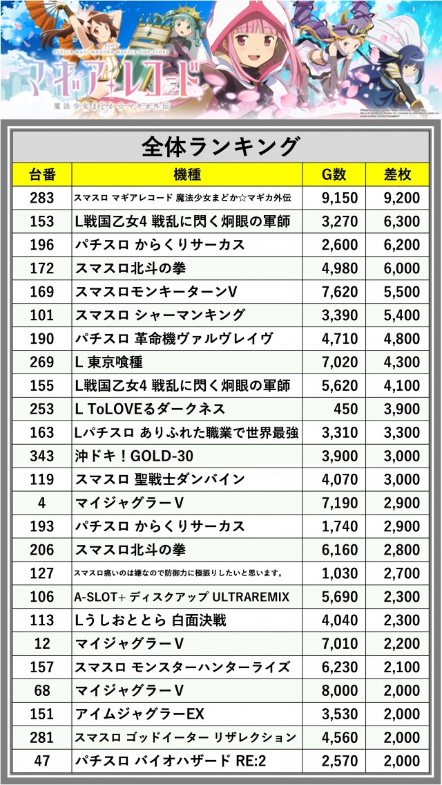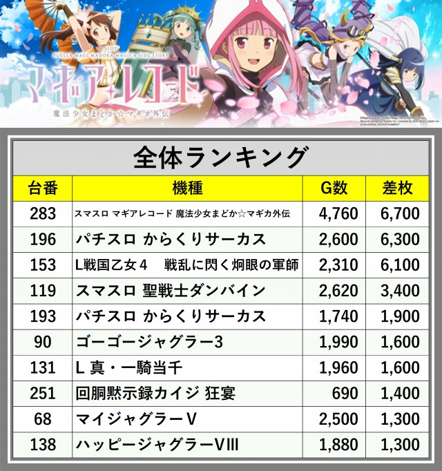 厳選された取材対象機種をはじめ、その他スロット全体から好記録が飛び出した!プレイヤーが楽しんだ1日を下記データにて振り返ってみて欲しい。