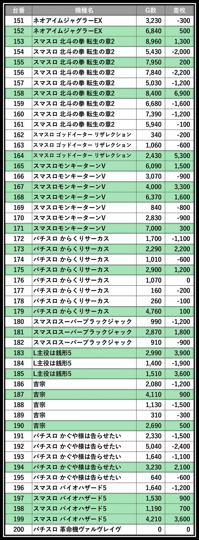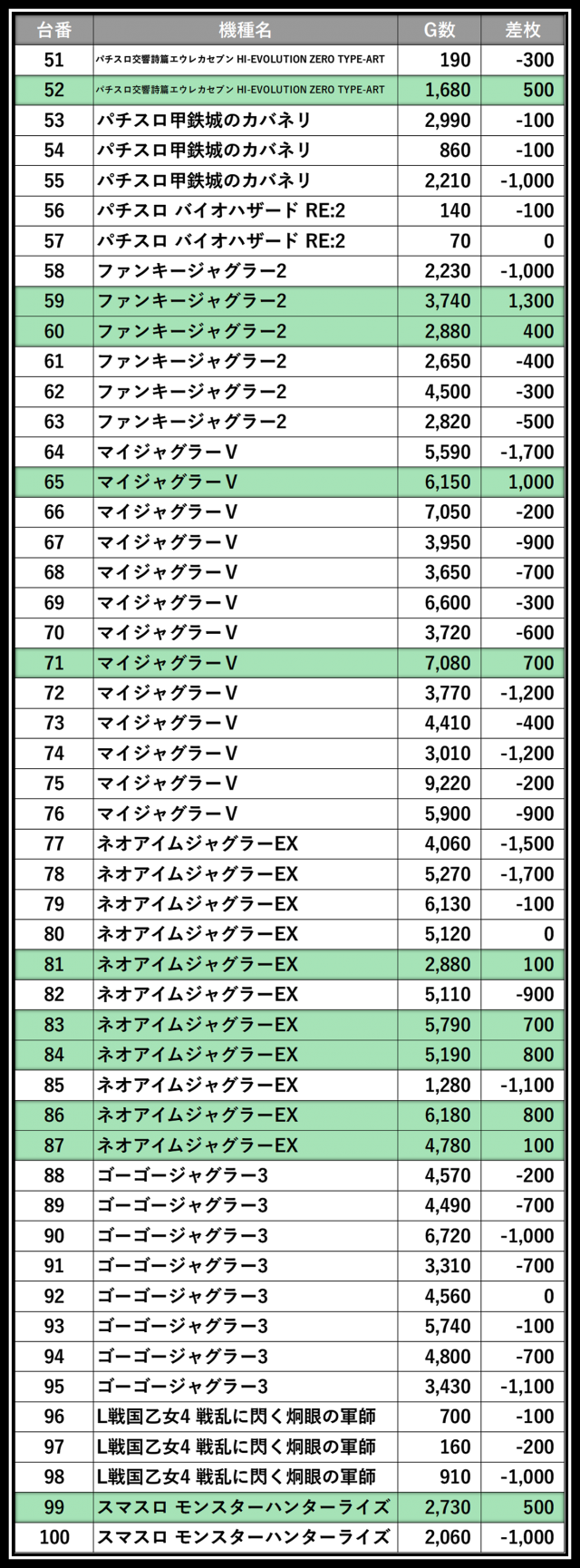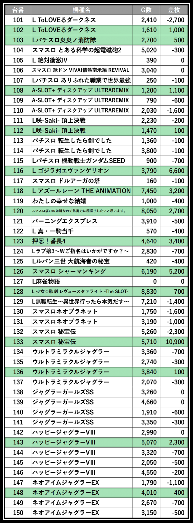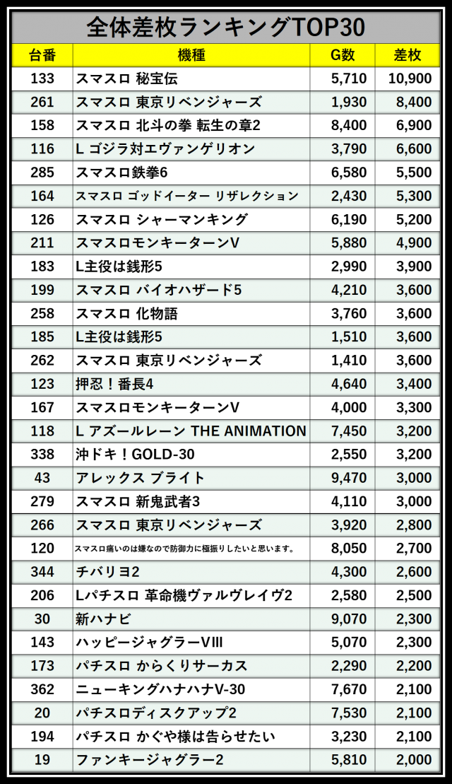※差枚数順に掲載しています