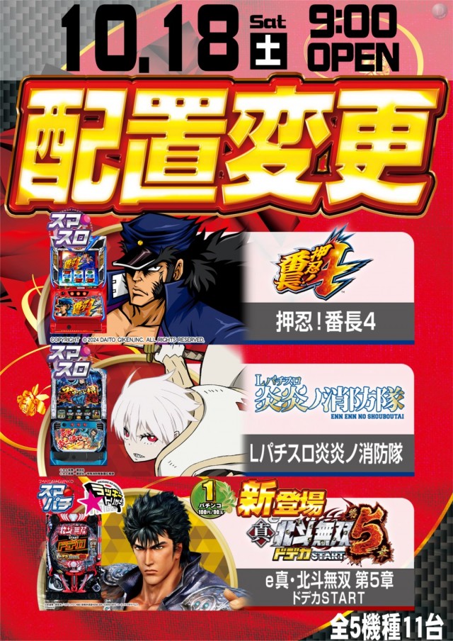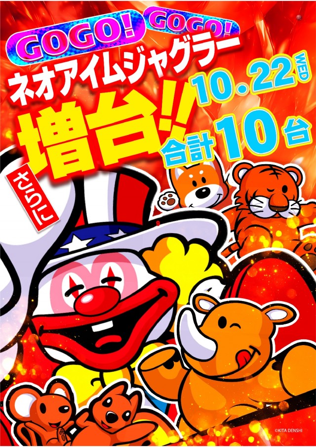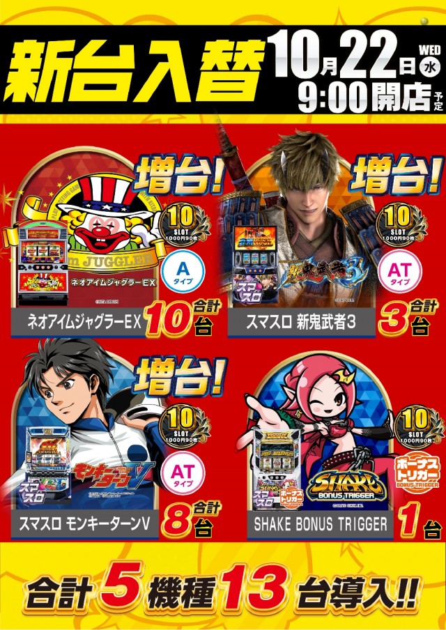 本日22日(水)ネオアイムジャグラーEXなど全5機種導入