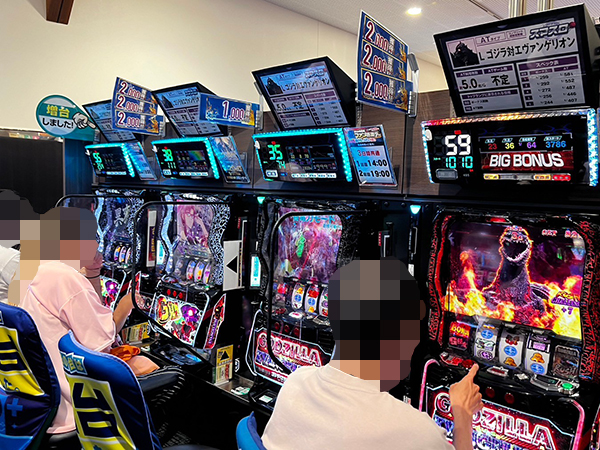 「L ゴジラ対エヴァンゲリオン」や「スマスロバジリスク~甲賀忍法帖~絆2 天膳 BLACK EDITION」のにぎわいも大きく、機種性能を存分に発揮するプレイヤーに羨望の眼差しが向けられていた。