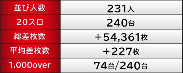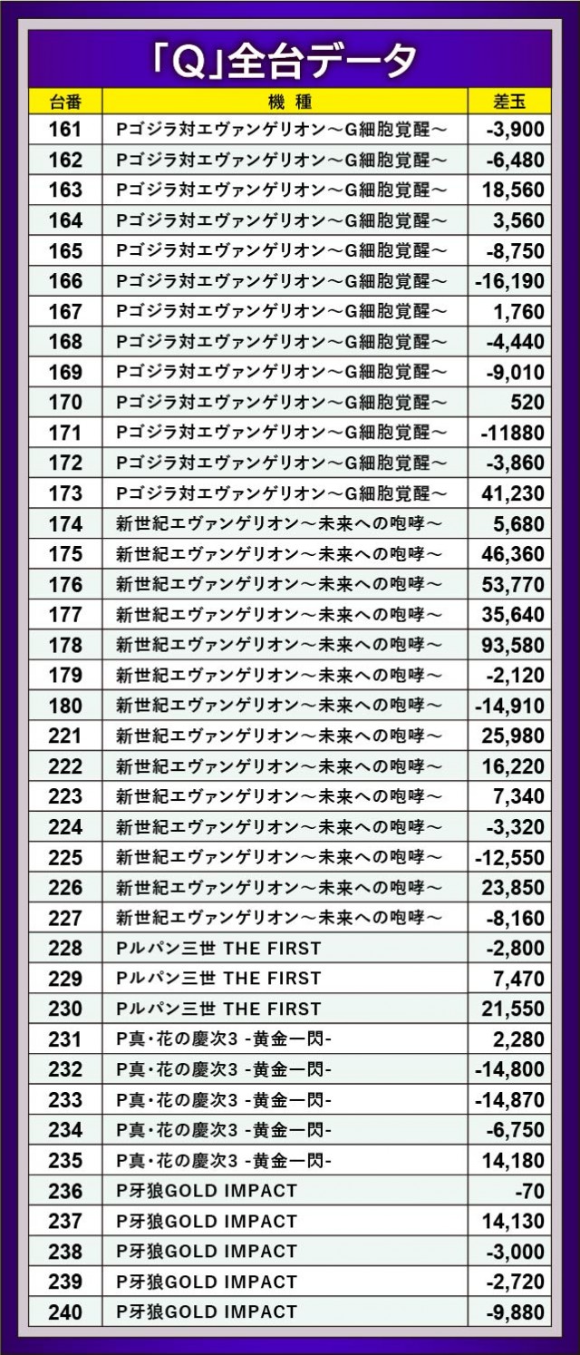 『新世紀エヴァンゲリオン〜未来への咆哮〜』にて178番台+93,580玉という信じられない記録が打ち立てられ、他にも176番台+53,770玉など、大きな数字を築いた台が多く見られたのが鮮烈だ。かつてない大きな盛り上がりに包まれ、当日のパチンココーナーを盛り上げたのは言うまでもない。また『Pゴジラ対エヴァンゲリオン〜G細胞覚醒〜』173番台+41,230玉や『Pルパン三世 THE FIRST』230番台+21,550玉など、他にも大きな熱気を放っていた台も確認でき、ファンの満足度は高かったに違いない。