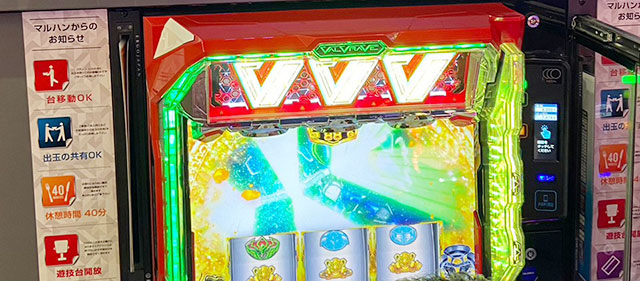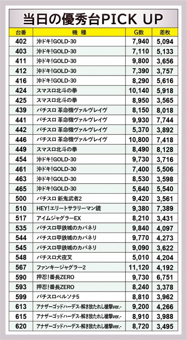 30台の優秀台をチェックすると、いずれも朝からじっくりと打ち込まれた形跡がある。遊技していたファンが確かな手ごたえを感じ取り、時間の限りレバーを叩いていたことだろう。その中でスマスロ勢の活躍が目立っており、『パチスロ 革命機ヴァルヴレイヴ』439番台+8,128枚や『スマスロ北斗の拳』449番台+8,128枚などが発生。他にも『沖ドキ!GOLD-30』416番台+5,616枚や『押忍!番長ZERO』590番台+6,751枚といった記録が見られ、店内は大きな盛り上がりに包まれていたと言える。