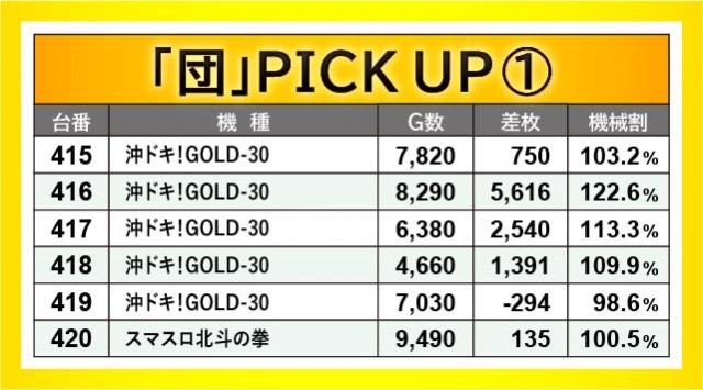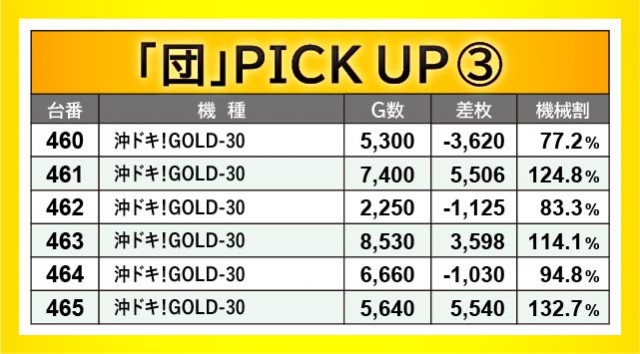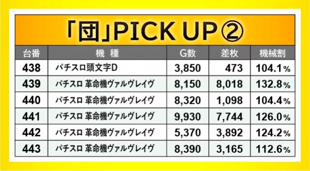 『沖ドキ!GOLD-30』416番台+5,616枚や461番台+5,506枚、465番台+5,540枚など、沖スロ勢の活躍が目立ち、さらには『パチスロ 革命機ヴァルヴレイヴ』439番台+8,128枚や441番台+7,744枚といった凄まじい熱が放たれていた。415~420番台・438~443番台・460~465番台・474~479番台の横並び好況スポットはいずれじっくりと打ち込まれており、ファンは自信を持ってレバーを叩いていたことだろう。