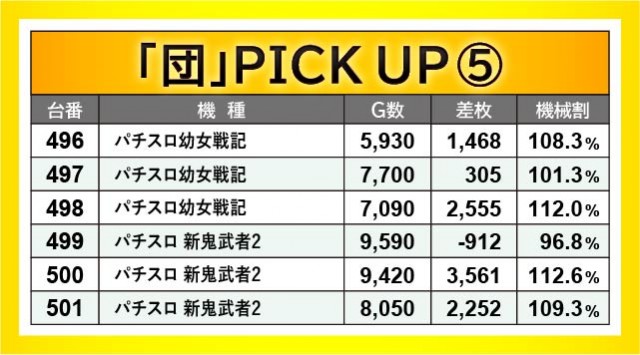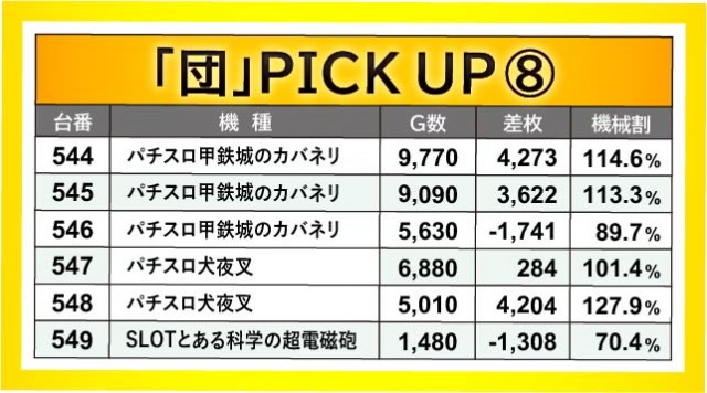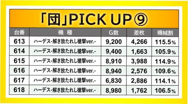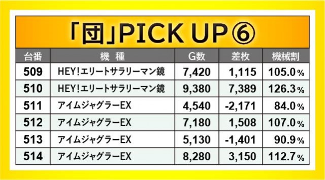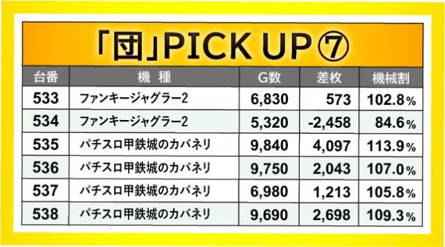 496~501番台・509~514番台・533~538番台の3ヶ所でも横並び好況スポットが形成されており、やはり朝から閉店まで遊技されていた様子が窺える。その中で『HEY!エリートサラリーマン鏡』510番台+7,389枚という大きな数字を確認でき、『パチスロ 新鬼武者2』500番台+3,561枚や『パチスロ甲鉄城のカバネリ』535番台+4,097枚など、他の台も追随するようにして熱を放っていたのが印象的だ。