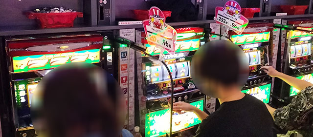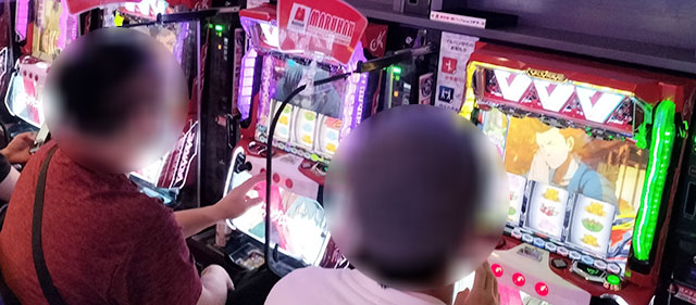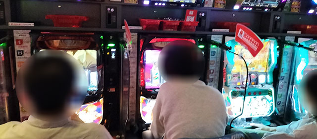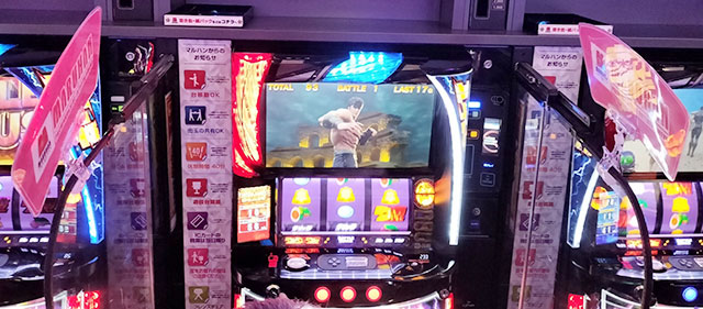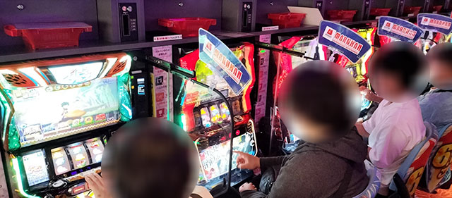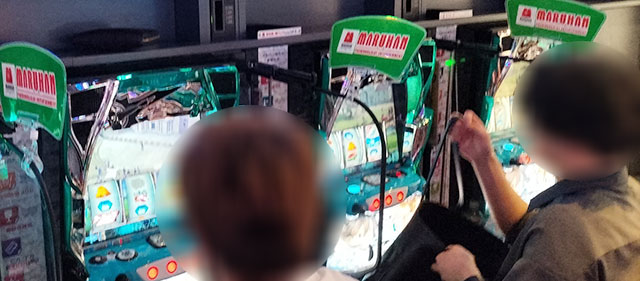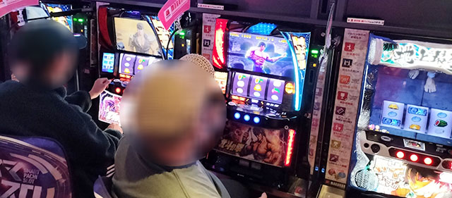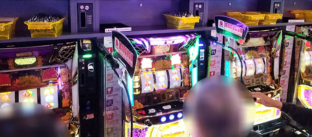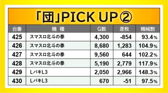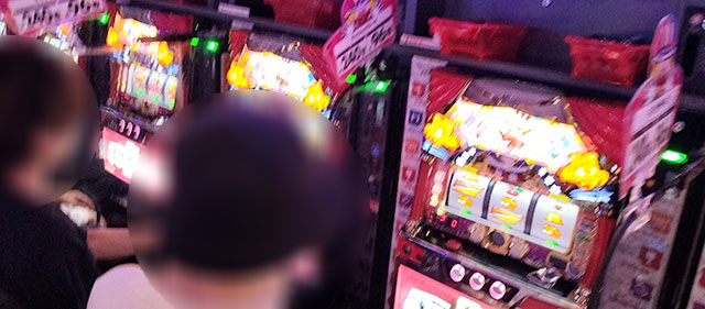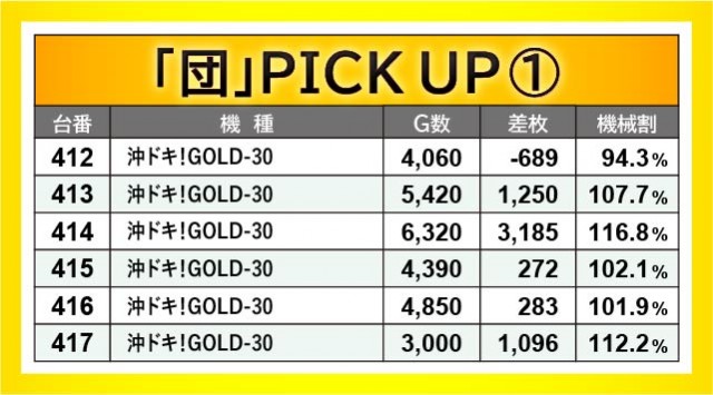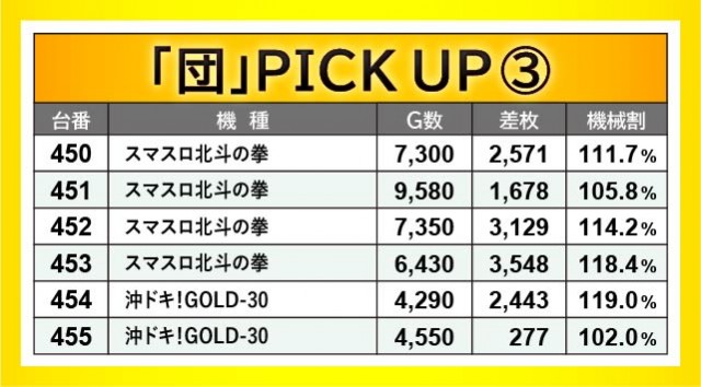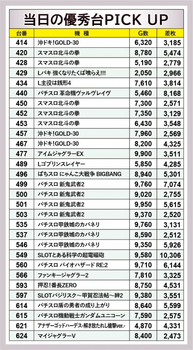 『沖ドキ!GOLD-30』『スマスロ北斗の拳』が中心となった412~417番台・425~430番台・450~455番台のエリアは、活気に満ちていたと言えよう。特に後者は朝からじっくりと打ち込まれ、8~9千回転台が目立っている。また差枚数にしても414番台+3,185枚や452番台+3,129枚、453番台+3,548枚など、しっかりと熱気を放っていたのも見逃せない。
