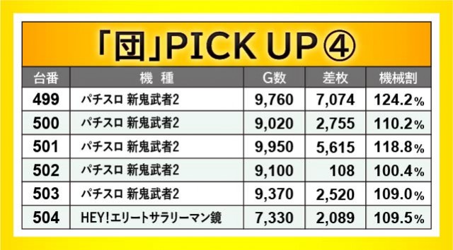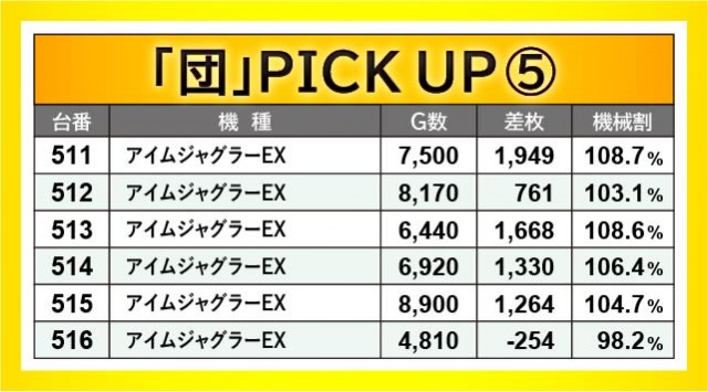 『パチスロ 新鬼武者2』499番台+7,074枚・501番台+5,615枚のように、6.5号機の活躍が見られた。回転数と差枚数が比例する展開が見られ、やはりファンは手ごたえを感じていたことだろう。また『アイムジャグラーEX』『ファンキージャグラー2』も朝から打ち込まれ、コンスタントなボーナス当選を披露していた。