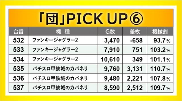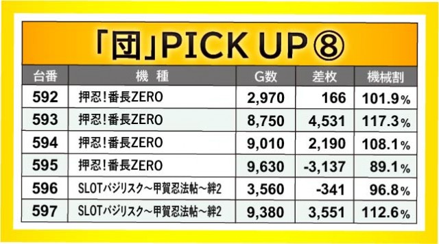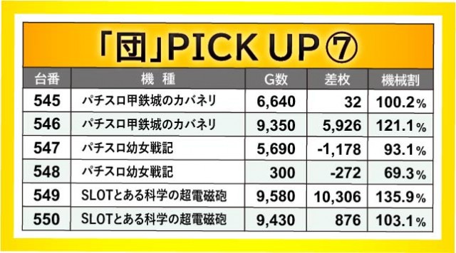 『パチスロ甲鉄城のカバネリ』546番台+5,926枚や『押忍!番長ZERO』593番台+4,531枚、『アナザーゴッドハーデス-解き放たれし槍撃ver.-』621番台+4,331枚と、こちらでも6.5号機群の活躍が印象的だ。その中で『SLOTとある科学の超電磁砲』549番台+10,306枚という大きな熱量を確認でき、遊技していたファンは充実のひと時を過ごしていたのは間違いない。スマスロ勢が全国を席巻しているが、同店の6.5号機には多大なチャンスがあると分かるだろう。