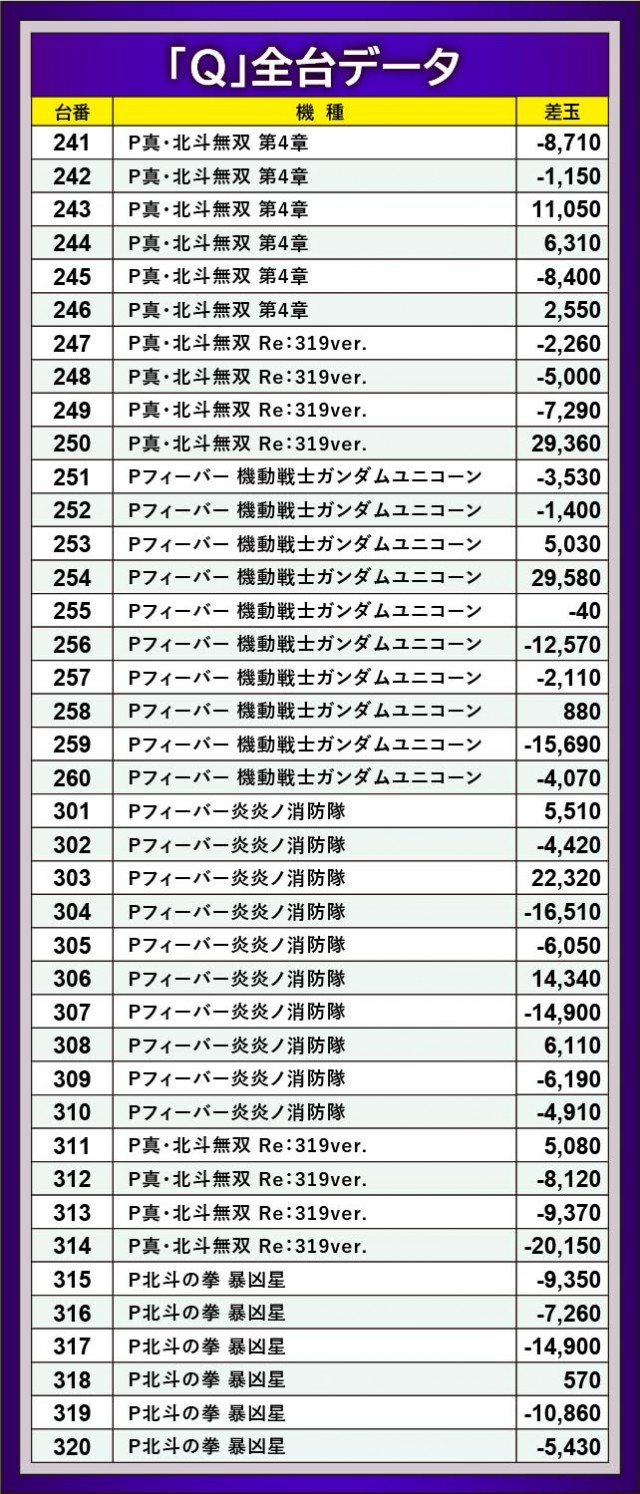 『北斗』シリーズが中心となったわけだが、『P真・北斗無双 Re:319ver.』250番台+29,360玉が奮闘するなど、全体的におとなしい結果となってしまった。しかし『Pフィーバー 機動戦士ガンダムユニコーン』254番台+29,580玉や『Pフィーバー炎炎ノ消防隊』303番台+22,320玉のように、確かな盛り上がりを確認できる。数字こそ伴わなかったが、それでもファンは力強くハンドルを握れたのではないだろうか。