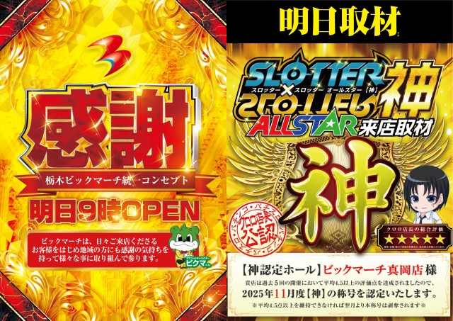 本日"11月13日"栃木ビックマーチ全店一斉9時OPEN