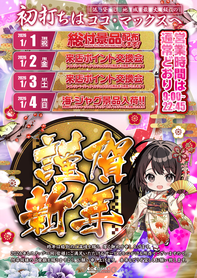 明日2026年1月1日(祝) 朝9時✾ 初打ちはココ・マックスで ✾
