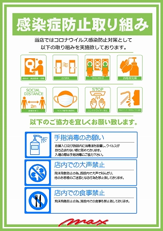 当店は感染拡大防止の為、マスクを着用していないお客様、体調の優れないお客様、県外からのお客様の入場制限を行ないます。ご理解とご協力をお願い致します。感染予防対策を徹底した上で本日5月11日(月)より営業を再開致します。