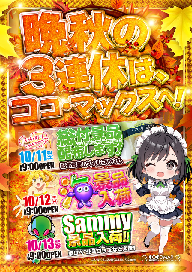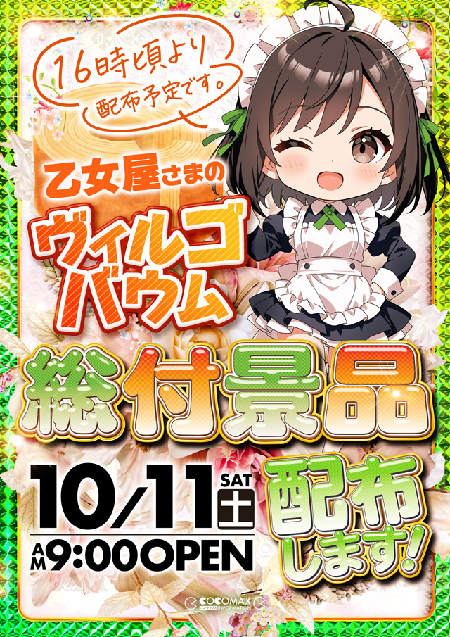 本日10月11日(土) 朝9時✾ 総付景品配布します ✾