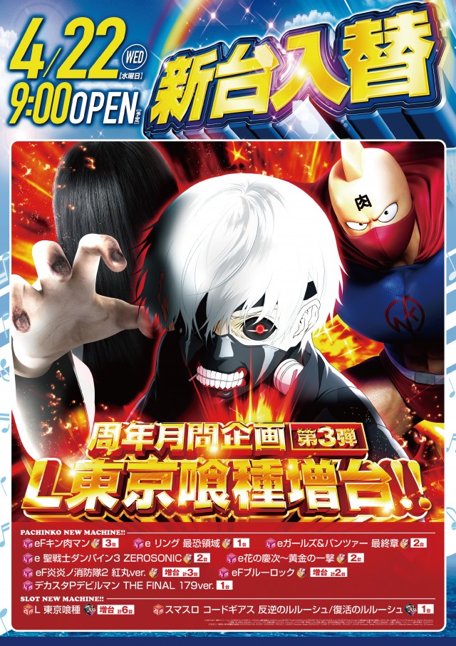 明日新台開放❗キンニクマン💪登場🎵人気機種L東京喰種🗼増台❗