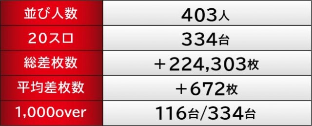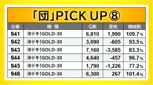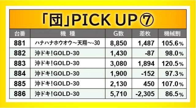 『沖ドキ!GOLD-30』はそのゲーム性からか、多くのゲーム数が消化されるという状況には至らなかった。それでも941~946番台の好況スポットでは、941番台・943番台のように、好感触から粘っていた様子が窺える。また同じく沖スロ機種『ハナハナホウオウ~天翔~-30』では、881番台+1,487枚という結果を出しており、今後とも両機種の動向から目が離せそうになさそうだ。