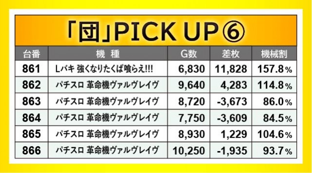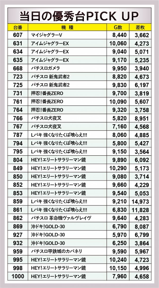 『Lバキ 強くなりたくば喰らえ!!!』859番台+14,973枚・861番台+11,828枚という鮮烈な記録が発生。さらには『パチスロ犬夜叉』766番台+8,951枚や『沖ドキ!GOLD-30』869番台+8,087枚など、各所で凄まじい熱気が放たれていた。また万回転OVERも上表から5台確認でき、消化されたゲーム数の多さを鑑みても、ファンの多くが相当な手ごたえを感じていたのは間違いないようだ。
