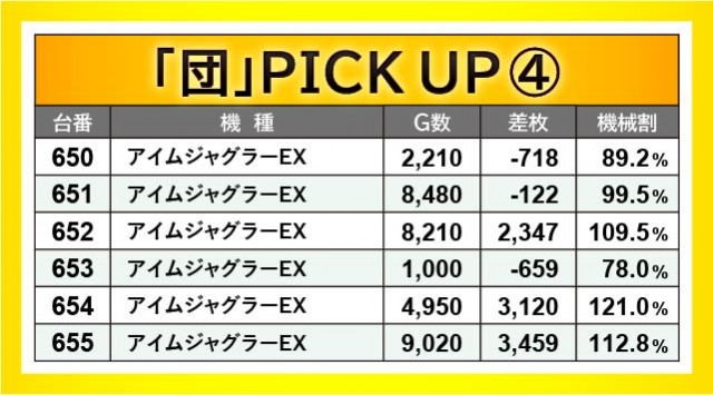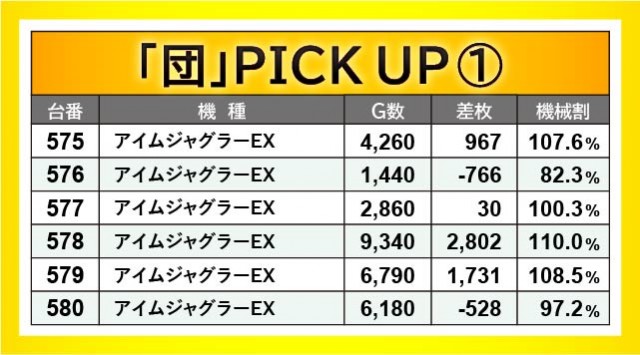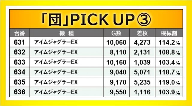 『アイムジャグラーEX』『マイジャグラーV』の両台は、万回転OVERを確認できるように、しっかりと手ごたえを感じていたのが分かる。575~580番台・601~606番台・631~636番台・650~655番台の4か所がホットスポットとなり、その中で634番台+5,071枚・635番台+5,235枚といった大台を突破する台が発生したことは、ファンにとって有意義な時間を過ごせる環境が整っていたと言えるだろう。