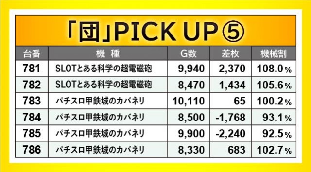 増台された人気機種『パチスロ甲鉄城のカバネリ』では万回転OVERが発生するも、展開に恵まれない状況だった様子が窺える。その隣、『SLOTとある科学の超電磁砲』は781番台+2,370枚のようにしっかりと結果を出し、さらには『Lバキ 強くなりたくば喰らえ!!!』861番台+11,828枚のような突出した熱気を放つ台も現れた。