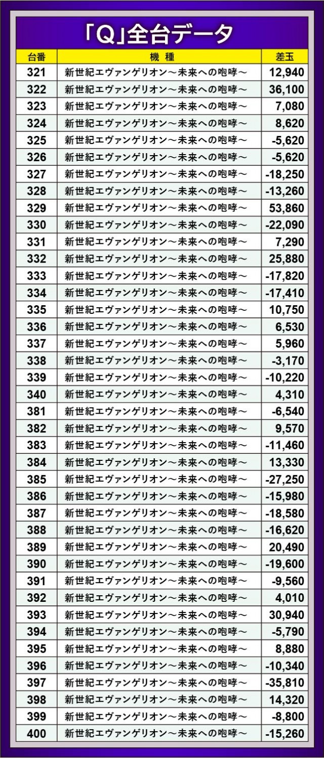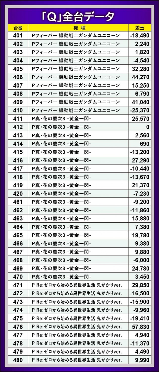 対して色褪せない人気を誇る名機『新世紀エヴァンゲリオン〜未来への咆哮〜』では、322番台+36,100玉や329番台+53,860玉といった好記録が見られる。『Pフィーバー 機動戦士ガンダムユニコーン』でも406番台+44,270玉を筆頭とした3~4万発OVER、『P Re:ゼロから始める異世界生活 鬼がかりver.』では476番台+57,830玉が発生し、当日は人気機種・注目の新台が大きく飛躍した1日になったと言えるかもしれない。