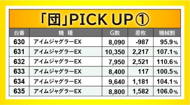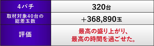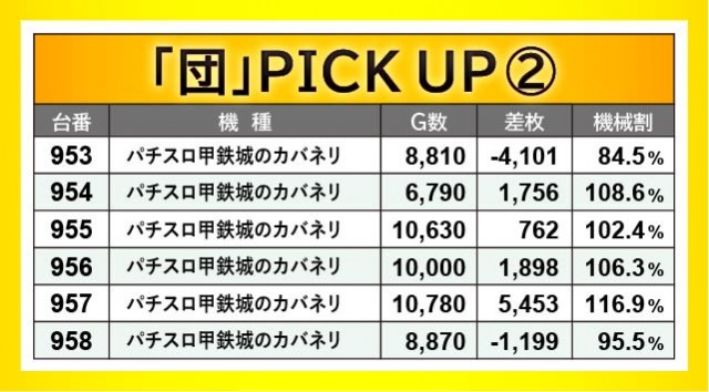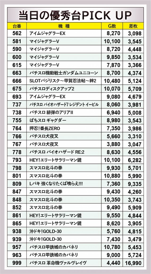 『アイムジャグラーEX』は全台プラス差枚とはならなかったが、各台がしっかりと遊技された形跡が窺える。631番台は万回転OVERを達成しており、+2,217枚という記録を残した。また『パチスロ甲鉄城のカバネリ』もレバーが力強く叩かれており、3台の万回転OVERを確認できる。大きくマイナスを叩いた台こそあるが、その感触は確かなものだったと言えるだろう。