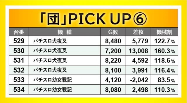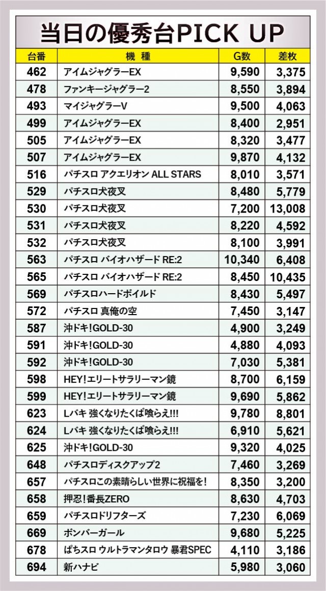 上表の通り、『パチスロ犬夜叉』『パチスロ バイオハザード RE:2』にて万枚OVERが発生した。他にも5~6千枚OVERという大台を突破する台が見られ、店内各所でどれほどの熱気が放たれていたのかが想像に容易い。『HEY!エリートサラリーマン鏡』598番台+6,159枚・『Lバキ 強くなりたくば喰らえ!!!』623番台+8,801枚といったようにスマスロの活躍もアリ、この日遊技していたファンの満足度は相当に高かったのではないだろうか。