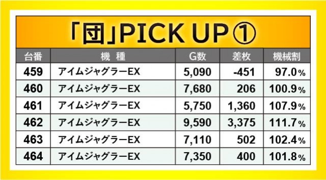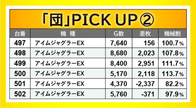 パチスロの王様『アイムジャグラーEX』は、安定したパフォーマンスを披露していたと言える。459~464番台・497~502番台の2ヶ所は朝からじっくりと打ち込まれており、その中で462番台+3,375枚・499番台+2,951枚と、まとまった出玉を確保するファンの姿が見られた。