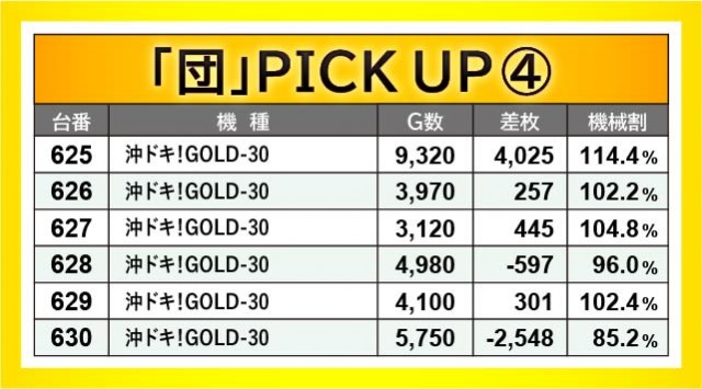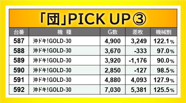 『沖ドキ!GOLD-30』もまた同様に、587~592番台・625~630番台の2ヶ所で突出した出玉を確認できた。591番台+4,093枚・592番台+5,381枚・625番台+4,025枚という突出した記録が生まれており、遊技していたファンはコンスタントに輝くハイビスカスに癒されていたことだろう。