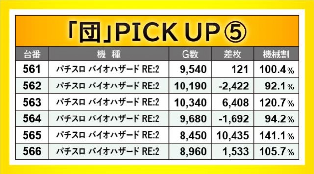 AT機からは『パチスロ バイオハザード RE:2』『パチスロ犬夜叉』『パチスロ幼女戦記』が活躍。先に述べたように、『パチスロ バイオハザード RE:2』565番台+10,435枚・『パチスロ犬夜叉』530番台+13,008枚という大記録が発生し、店内の盛り上がりに大きく貢献していた。『パチスロ幼女戦記』も奮闘して+2,498枚という記録を生み出し、しっかりと熱気を放っていたのも見逃せない。