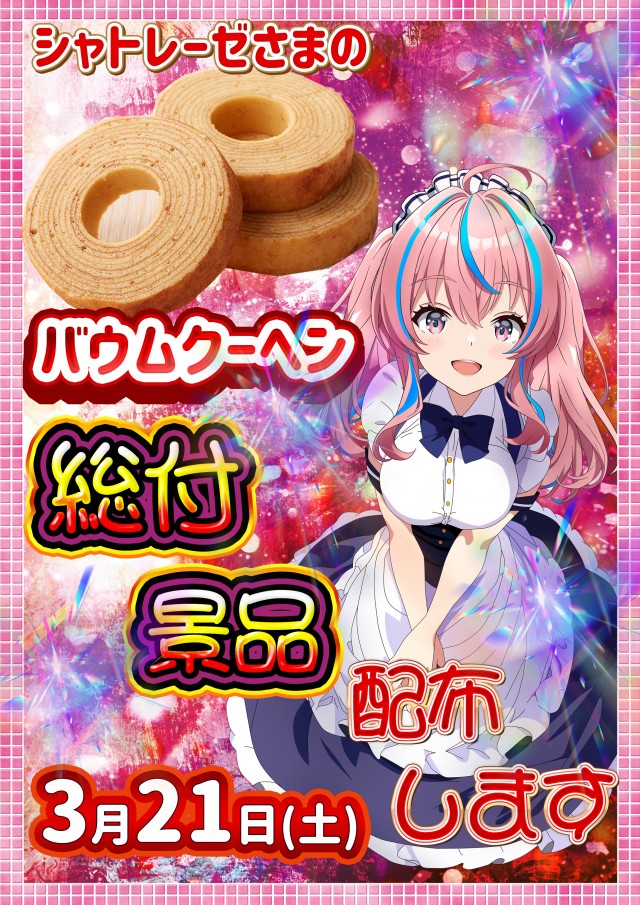 明日3月21日(土) 朝9時OPEN総付景品配布予定※朝8:40入場抽選締め切り
