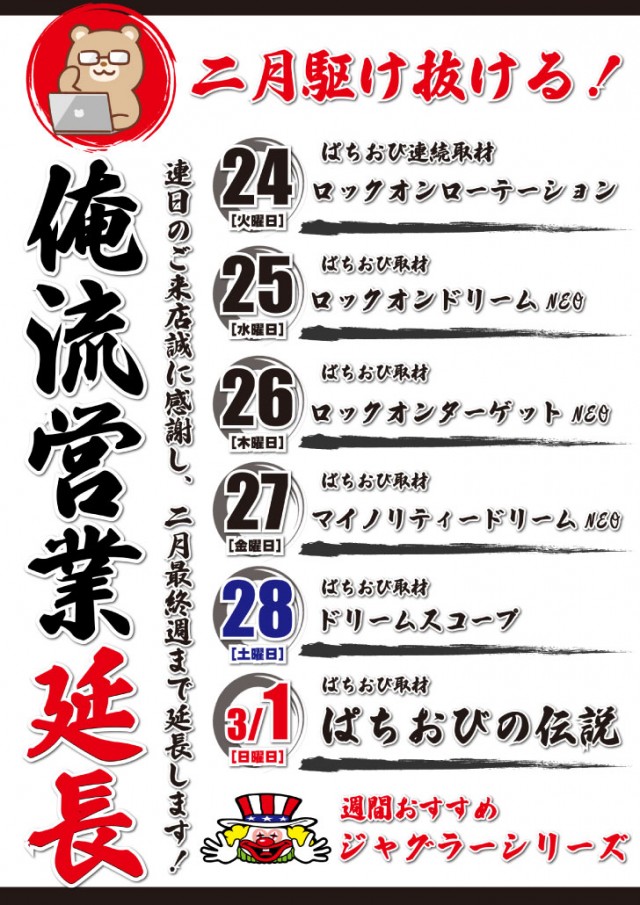 三連休・最終日・総付景品もあり!2/23・朝9時開店