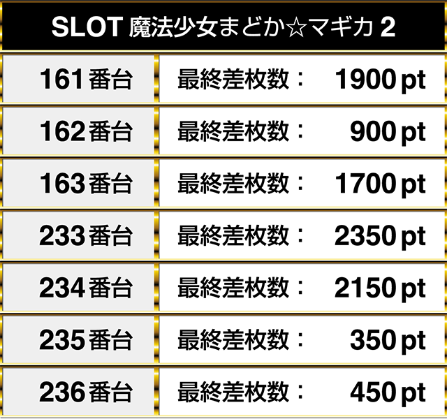 『SLOT魔法少女まどか☆マギカ2』の2箇所が3台以上の並びでプラスptを記録し、そのうちの2台が2000ptオーバー!!