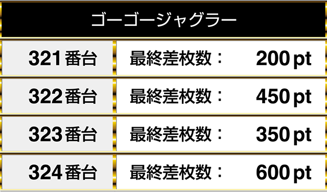 『ゴーゴージャグラー』は321番台から324番台までの4台が並んでプラスptとなった。