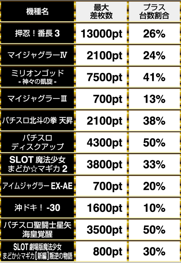 最終的にはどちらの機種も3割以上の台がプラスptを記録した。
