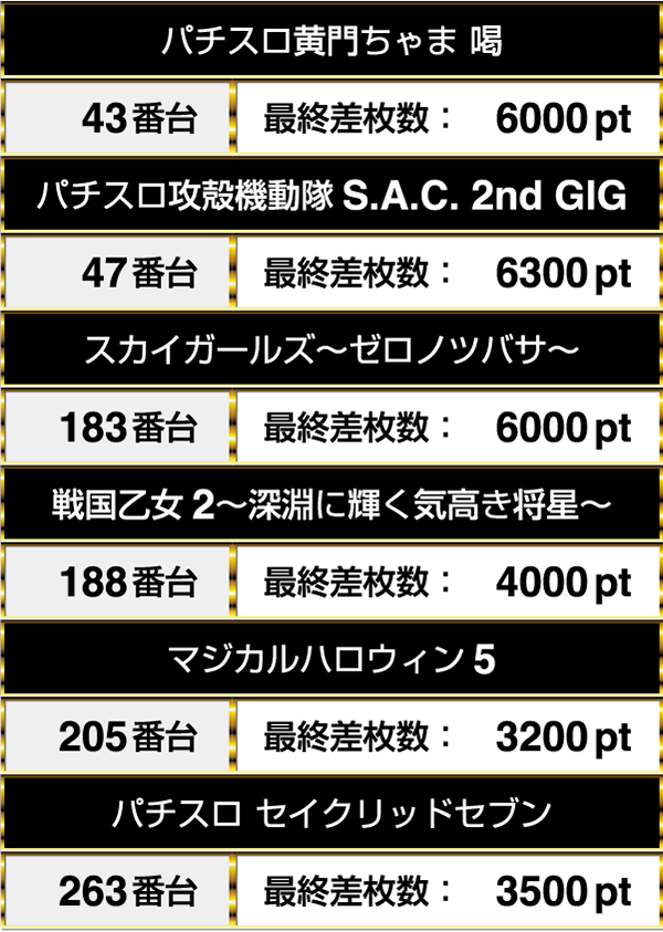 『パチスロ黄門ちゃま 喝』の43番台と『スカイガールズ~ゼロノツバサ~』の183番台が6000pt!