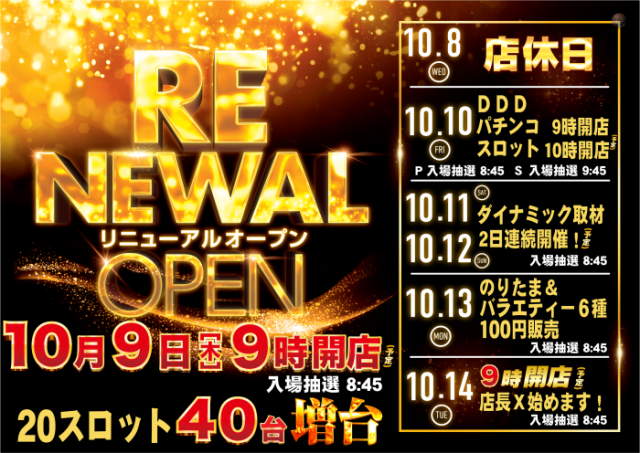 本日10月9日(木)20スロット増台!全26機種導入