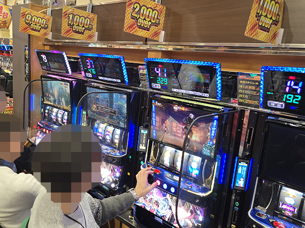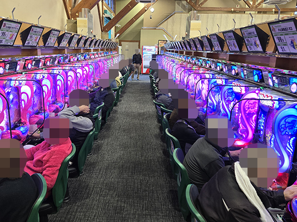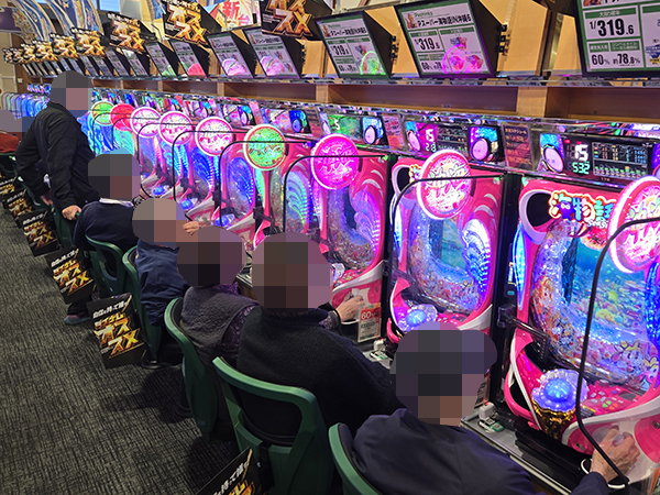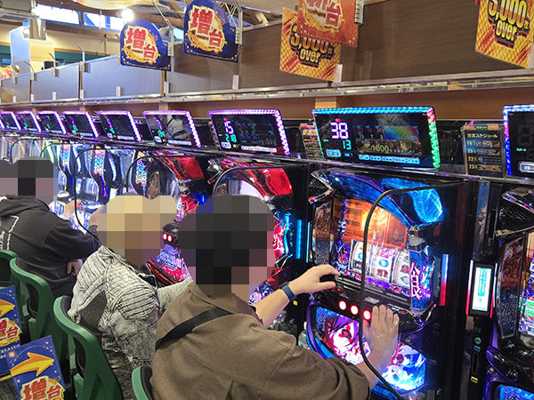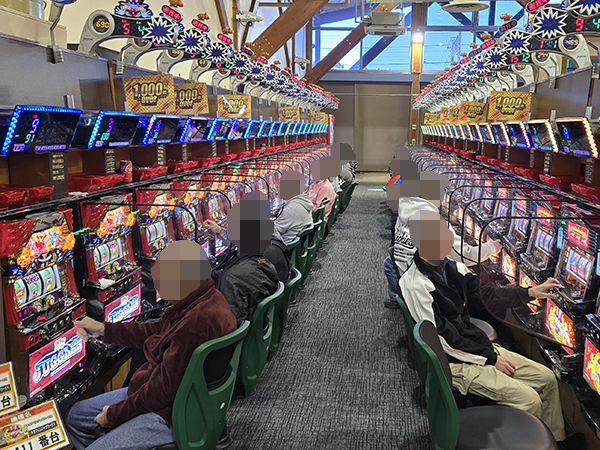 取材時は既に多くのプレイヤーが集結し、パチンコ・パチスロを問わずにぎやかな状況となっていた。