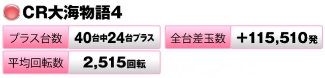 40台中24台がプラスで、全台差玉数は+115,510発と、10万発の大台を越えてきた。
