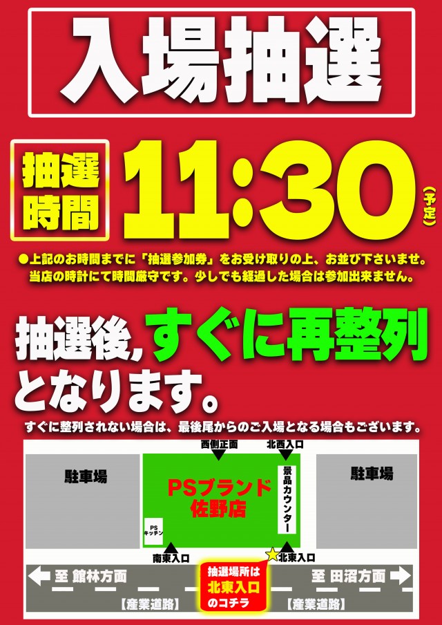 通常、8:40(予定)までに所定の場所にお並び頂いたお客様へ「抽選参加券」をお配り致します。「抽選参加券」配布後、すぐに抽選開始となります。※混雑が予想される場合には抽選時間が変更となる場合がございますので別途ご案内致します。 |