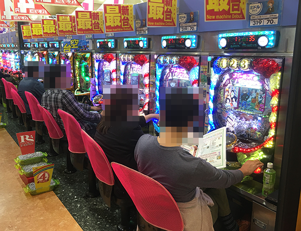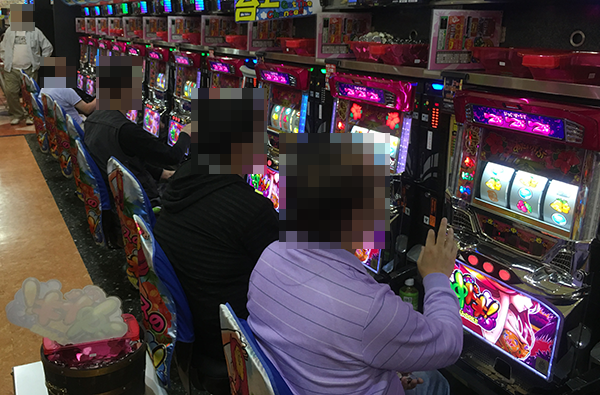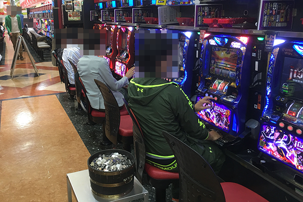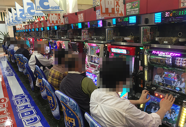 夕方頃のホール内は、パチンコ・パチスロともに大勢のプレイヤーでにぎわいをみせていた。