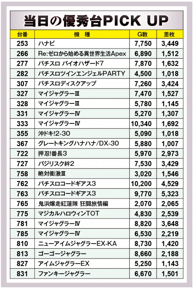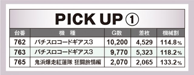 優秀台をチェックすると、『パチスロコードギアス 反逆のルルーシュ3』が活躍。+5,323枚を記録した763番台、+4529枚だった762番台が出玉を競い合った。この他にも『ハナビ』、『パチスロディスクアップ』、『SLOTバジリスク〜甲賀忍法帖〜絆2』、『マイジャグラーⅣ』、『マイジャグラーⅢ』などが好調さを見せた。