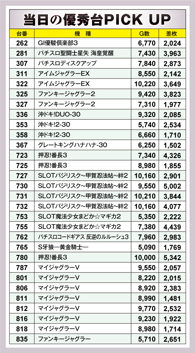 人気マシンが遠慮なく本領を発揮し、プラス差枚が続出。『ジャグラー』シリーズは元より、『沖ドキ!DUO-30』『沖ドキ!2-30』『グレートキングハナハナ-30』などの沖スロ勢、さらには高純増AT機にも優秀台の痕跡がズラリ。『SLOTバジリスク~甲賀忍法帖~絆2』&『押忍!番長3』から5,000枚オーバーが生まれてたのも必然だったのかもしれない。
