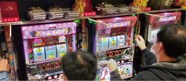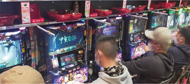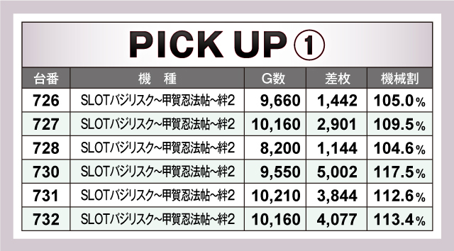 なんとなんと、6台並びで凄まじいまでの衝撃を与えてくれたのは『SLOTバジリスク~甲賀忍法帖~絆2』。6台全てがプラス値となっており、同機周辺ではザワめきが起きるほどの光景に。参考までにこの6台は、