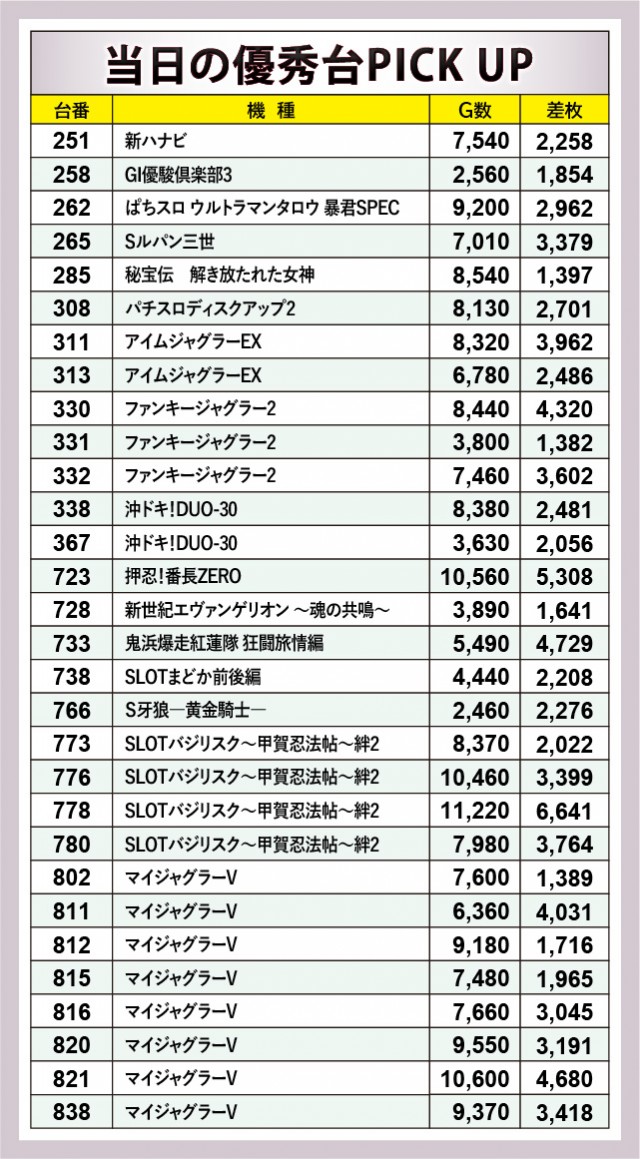『マイジャグラーV』といえば、シリーズ機の中でも高い人気を誇っている。30台ピックアップされる優秀台だが、そこに8台もランクインしており、高い信頼性を窺うことができるだろう。4千枚OVERが2台・3千枚OVERも3台発生する状況で、遊技するファンはGOGOランプの輝きにウットリしていたはずだ。もちろん、『アイムジャグラーEX』『ファンキージャグラー2』も負けじと活躍しており、ノーマル機が目立った内容となった。