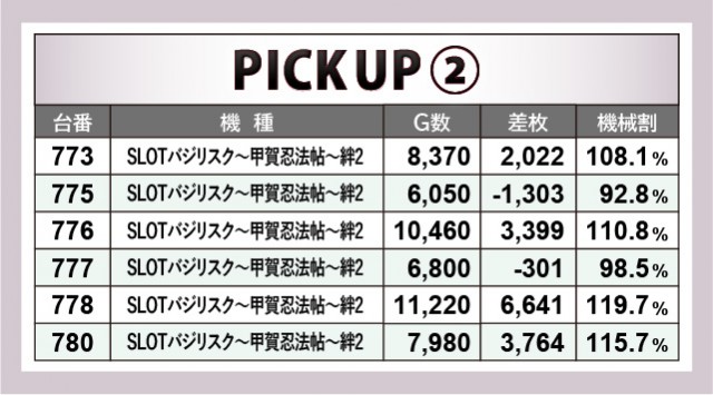全国のホールを席巻する人気AT機といえば、『押忍!番長ZERO』『SLOTバジリスク~甲賀忍法帖~絆2』の両機種だ。ともに5千枚OVERが発生する活気を披露し、特に後者『SLOTバジリスク~甲賀忍法帖~絆2』では2~3千枚OVERが多く発生する活躍となった。さらに万回転を達成する台が5台あり、確信を持ってレバーを叩いていた光景が容易に想像できるだろう。