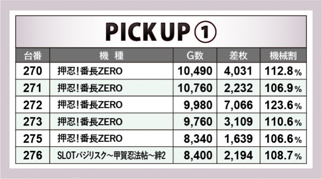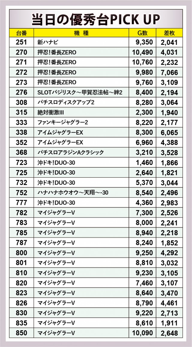 大きな見どころは『マイジャグラーV』でまとまった出玉を放出している点だろう。いずれの台も回転数が多く、800番台+4,292枚や826番台+4,461枚といった好記録に目を奪われてしまうばかり。さらに『アイムジャグラーEX』でも352番台+4,388枚だけでなく、338番台+6,065枚という熱気の噴出も鮮烈だ。『ジャグラー』シリーズの活躍が目立つ傍ら、『押忍!番長ZERO』が人気機種らしい活躍を披露していたのも見逃せない。