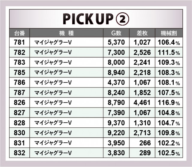 『押忍!番長ZERO』を中心とした270~276番台では、朝から閉店までじっくりと遊技された形跡が見られる。その中で当日の最高記録である272番台+7,066枚が目を惹くばかりで、同様に270番台・273番台でも熱気が放たれていた。また『マイジャグラーV』でも6台横並びスポットが2ヶ所も形成されており、781~787番台・826~832番台の両エリアは全台プラス差枚を達成して、ファンに喜びを与えていたのが印象的だ。