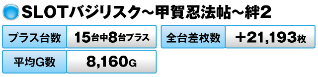15台中8台がプラスで全台差枚数は+21,193枚だった。